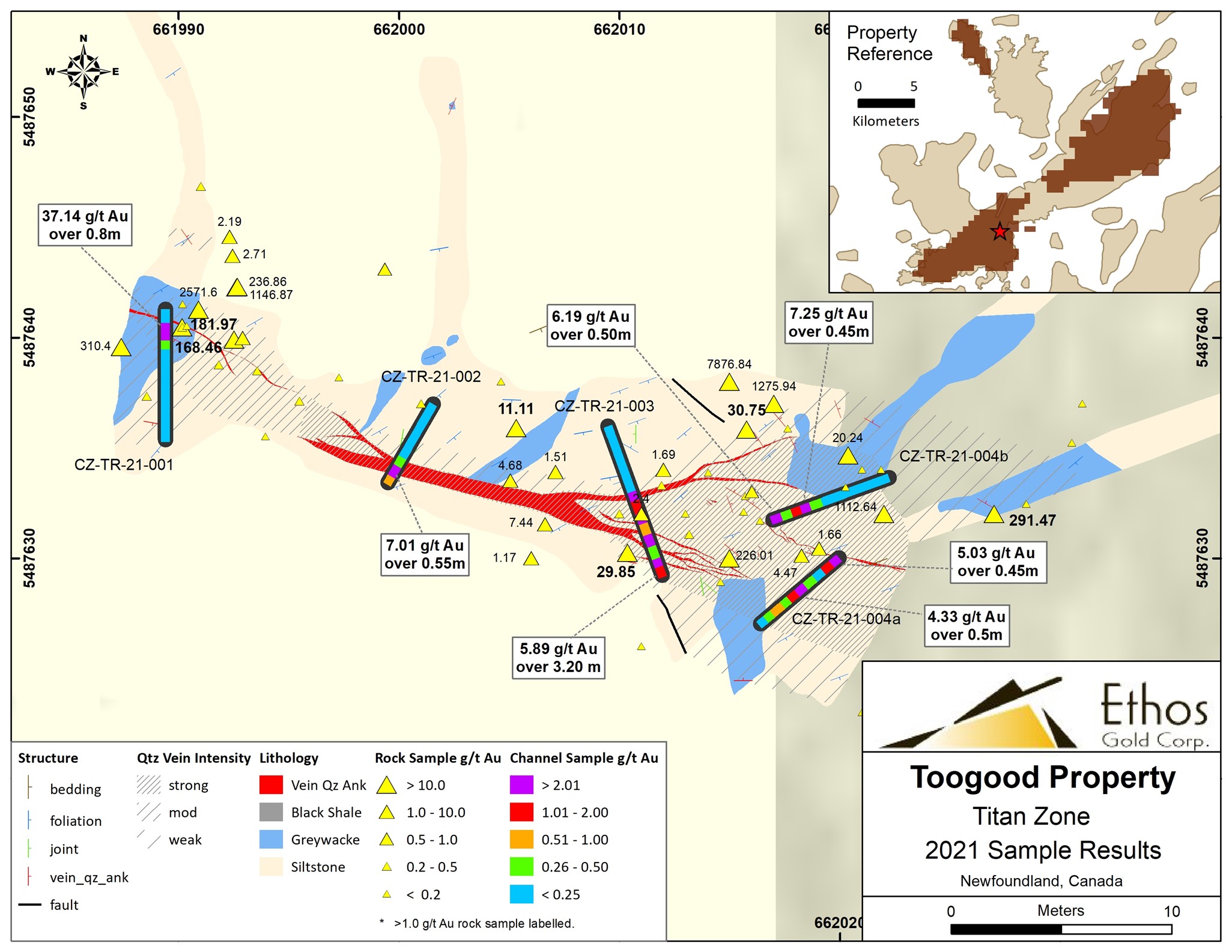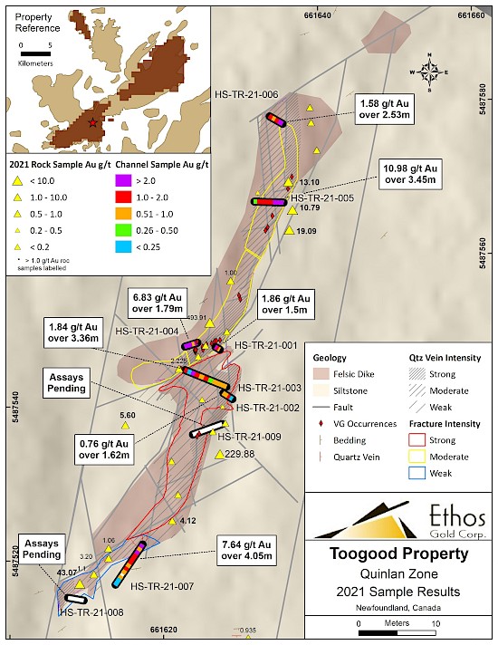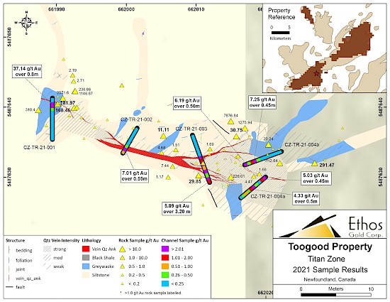 Vancouver, BC – March 1, 2022, Ethos Gold Corp. (“Ethos” or the “Company”) (TSXV: ECC; OTCQB: ETHOF; Frankfurt: 1ET) is pleased to announce initial channel results at the Quinlan and Titan showings, from the Company’s Toogood property which encompasses 118km2 of mineral claims on New World Island, Newfoundland.
