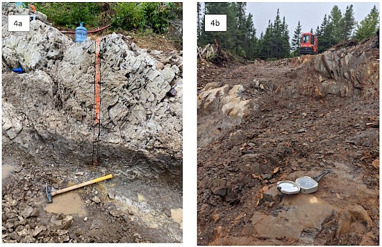 - At the Quinlan showing, stripping of the outcrop and subsequent geological mapping, and sampling has identified a 200m by 15m wide mineralized zone, open to depth and concentrated in along north-northeast trending structure. A total of 59 channel samples across seven separate channels (total 30.08m) have been collected to test the continuity of mineralization. Channel samples returned assays of 10.98 g/t Au over 3.45m, 7.64 g/t Au over 4.05m, 6.83 g/t Au over 1.79m, 1.84 g/t Au over 3.36m, 1.86 g/t Au over 1.5m, 0.76 g/t Au over 1.62m, and 1.58 g/t Au over 1.6m (Figure 1, 3, and 4). Results for Channels 8 and 9 (14 channel samples) remain pending.