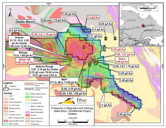 - In winter and spring of 2021, Ethos completed compilation and validation of existing historical data, and together with the new aeromagnetic data, defined 44 prospective targets on which ground truthing and prospecting were conducted during Phase 1 field work conducted by IOS Geoscientific Services from mid-June to early July 2021. Numerous mineralized meta-iron formations were identified, some associated with historic gold showings, and some representing new showings.