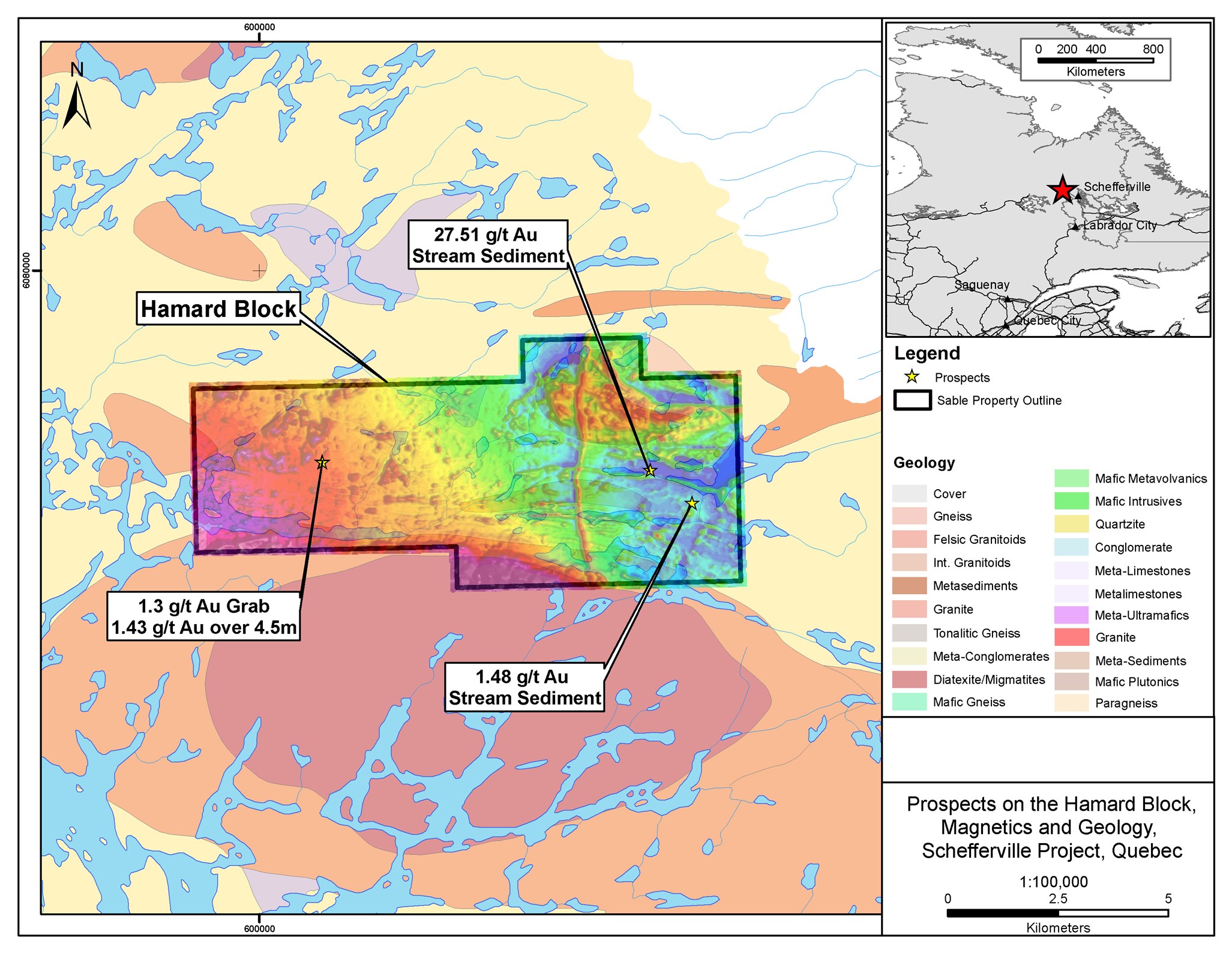 The Schefferville Gold Project is centered on a structural corridor characterized by faulted and sheared iron formation stratigraphy extending for approximately 60 km on the Sable block, and 10 km on the Hamard block. The project was acquired through staking (see Company’s news release dated August 20, 2020) and three subsequent acquisition transactions (see news releases dated September 4, 2020; and October 15, 2020; and February 16, 2021).