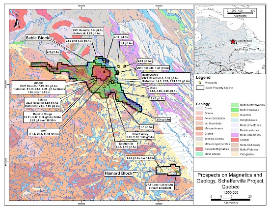 The Schefferville Gold Project is centered on a structural corridor characterized by faulted and sheared iron formation stratigraphy extending for approximately 60 km on the Sable block, and 10 km on the Hamard block. The project was acquired through staking (see Company’s news release dated August 20, 2020) and three subsequent acquisition transactions (see news releases dated September 4, 2020; and October 15, 2020; and this release).