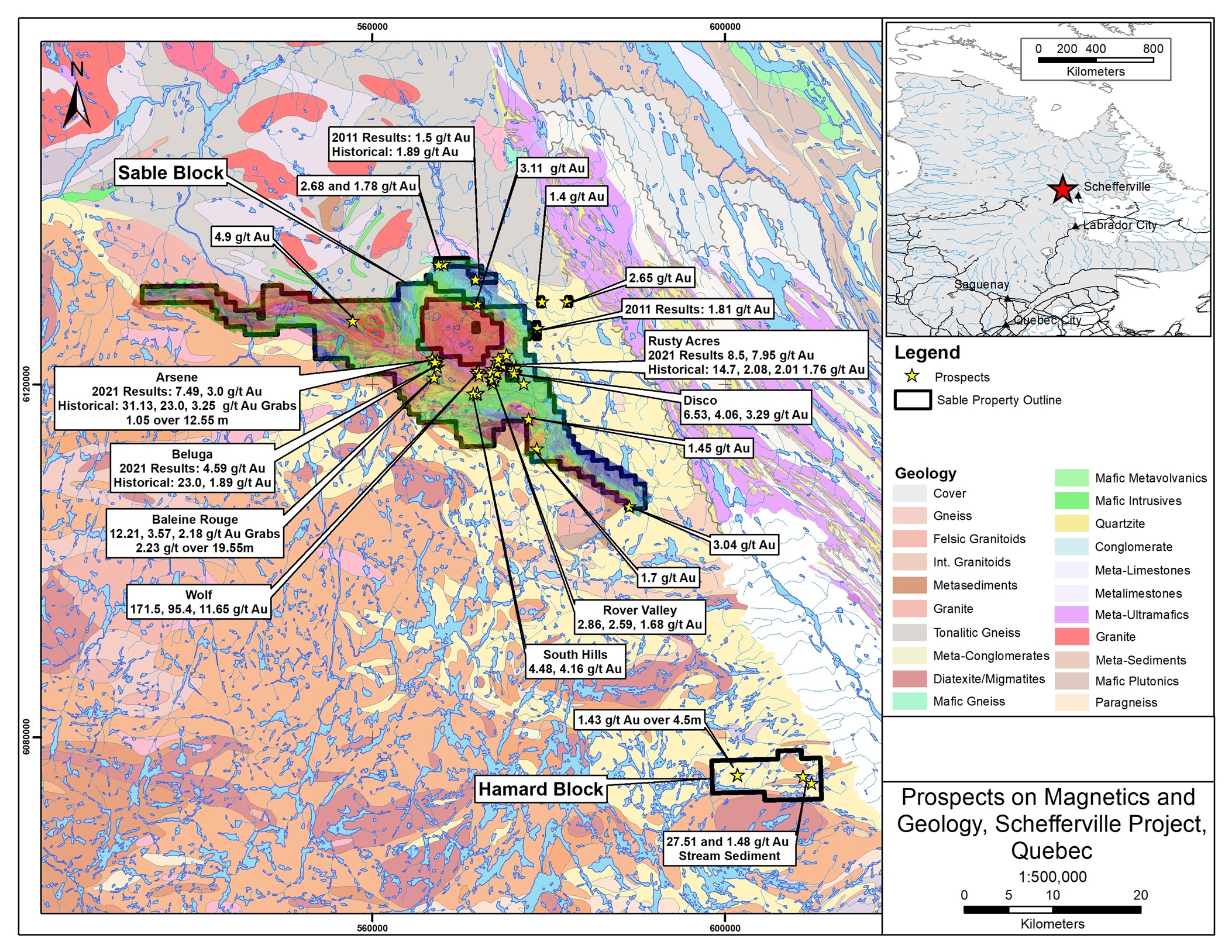 The Schefferville Gold Project is centered on a structural corridor characterized by faulted and sheared iron formation stratigraphy extending for approximately 60 km on the Sable block, and 10 km on the Hamard block. The project was acquired through staking (see Company’s news release dated August 20, 2020) and three subsequent acquisition transactions (see news releases dated September 4, 2020; and October 15, 2020; and this release).