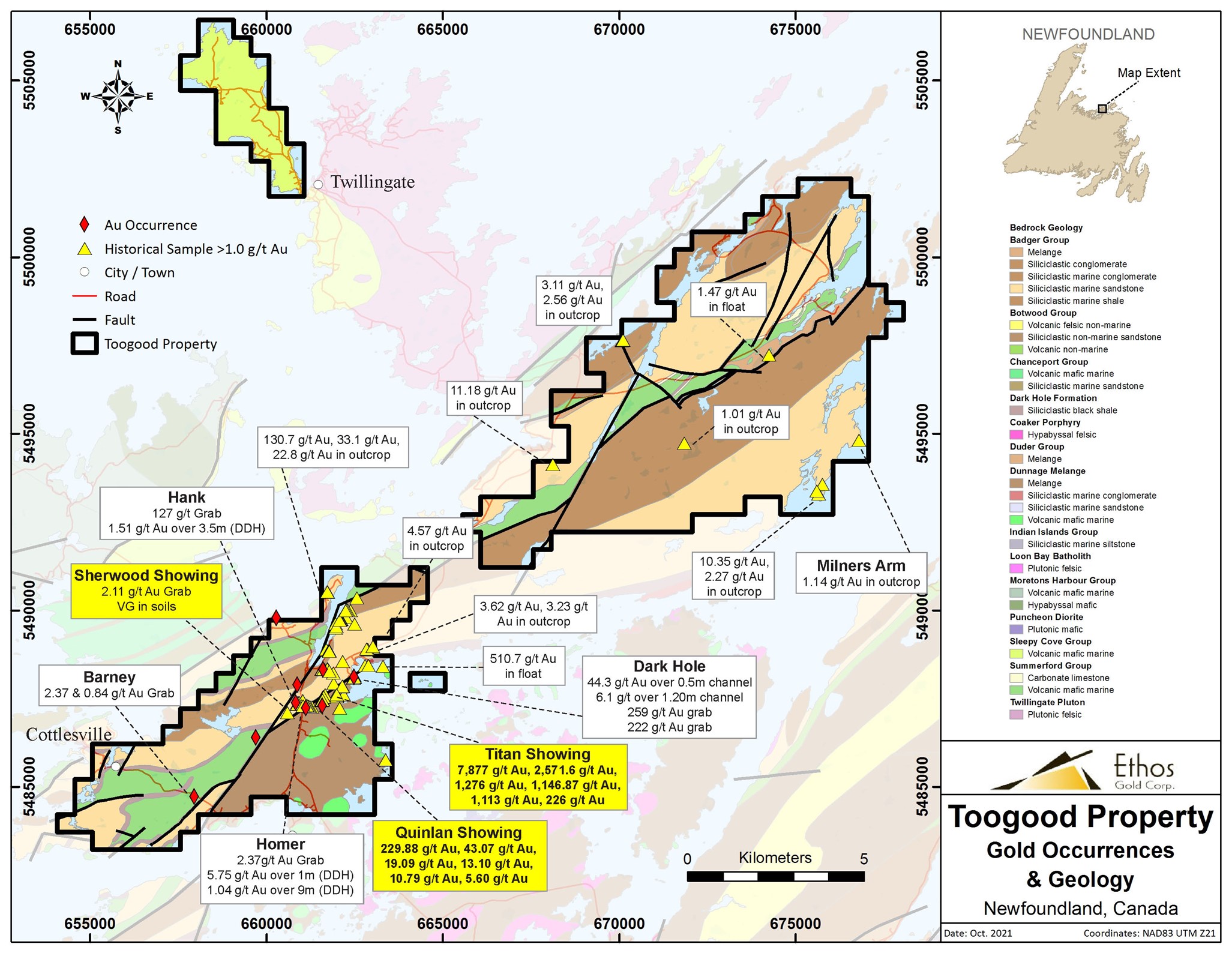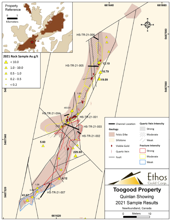 Vancouver, BC – November 24, 2021, Ethos Gold Corp. (“Ethos” or the “Company”) (TSXV: ECC; OTCQB: ETHOF; Frankfurt: 1ET) is pleased to announce additional bonanza grade outcrop samples at the newly named Quinlan and Titan showings in its first pass exploration program at the Toogood property which encompasses 118km2 of mineral claims on New World Island, Newfoundland.