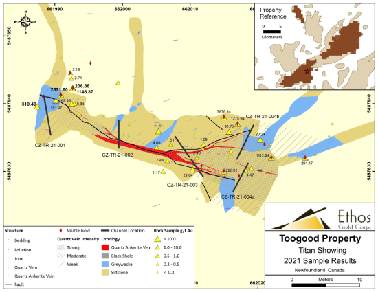 Ethos Samples 2,571 g/t Au at Titan, and Identifies Additional Targets, Toogood Project, Newfoundland