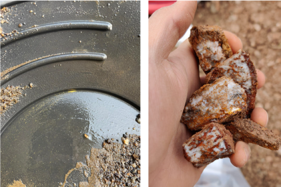 Figure 4. Panned soil sample with visible gold, and Quartz Rock fragments from the new Sherwood showing.